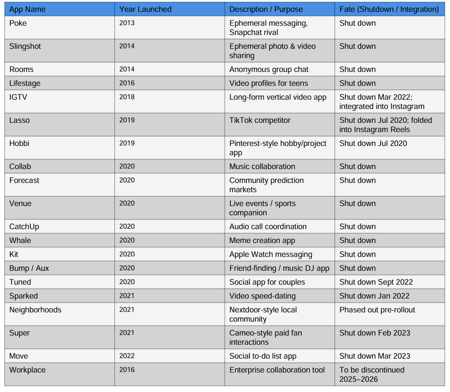 To illustrate that people don’t actually want more standalone apps, consider Meta’s repeated attempts to spin up separate products for experiences that were ultimately better delivered within an existing platform, or already had a superior use case elsewhere.