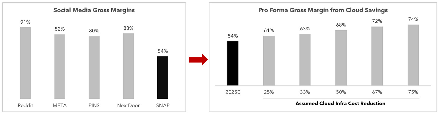 Assuming a 25-75% reduction in Snap’s cloud costs would result in a gross margin uplift of 7-20%, bringing them closer to peers