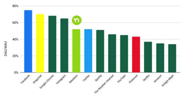 Snapchat’s conversion of MAUs to DAUs is also best in class, trailing only Facebook and WhatsApp in the US (TikTok US not shown below but is ~50% MAU→DAU).