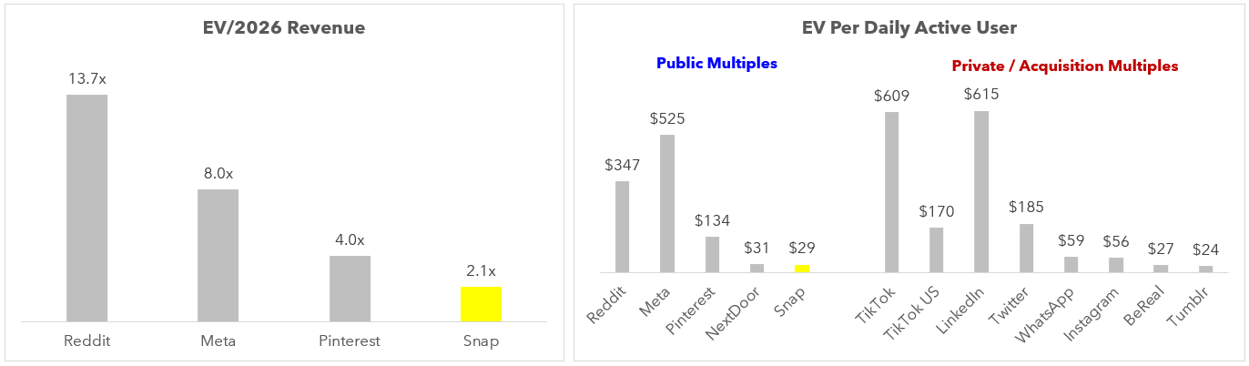 Looking at historical social media acquisitions also shows that Snap is on the low end of the historical valuation range.