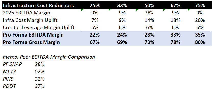 If you assume a 75% reduction in infrastructure costs, and a 50% reduction in the percent of revenue shared with creators, the tailwind to gross margin and EBITDA margin is ~26%, which would bring Snap’s pro forma margins in-line with peers at ~80% and ~35%, respectively.